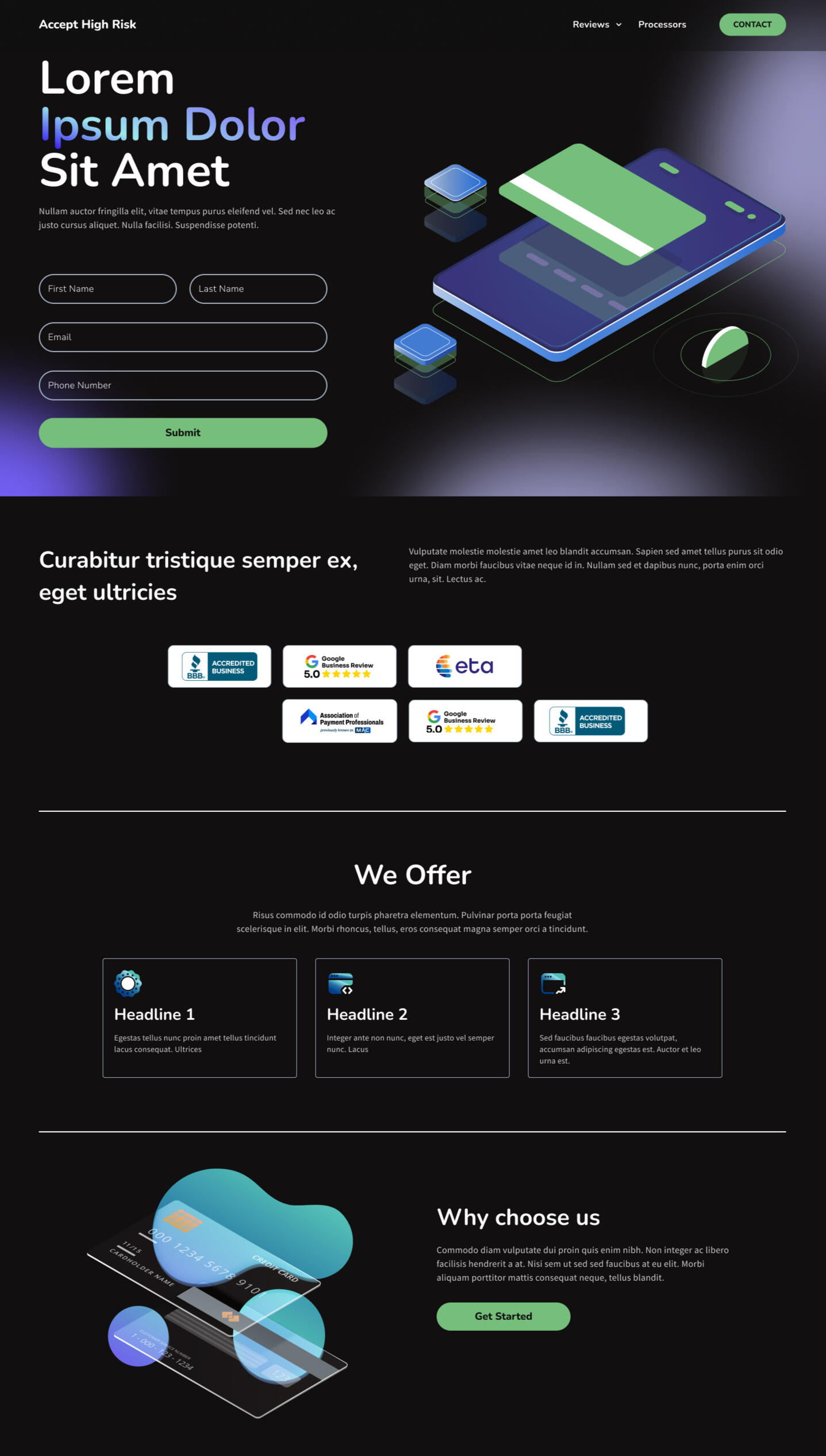 This landing page for Accept High Risk was designed for attracting leads for credit card processing services in high-risk industries. My design emphasized clarity and trust, with a streamlined layout that guided users through the benefits of partnering with Accept High Risk. The result was a visually appealing and highly effective landing page that not only captured more qualified leads but also helped position Accept High Risk as a trusted solution in a competitive market.